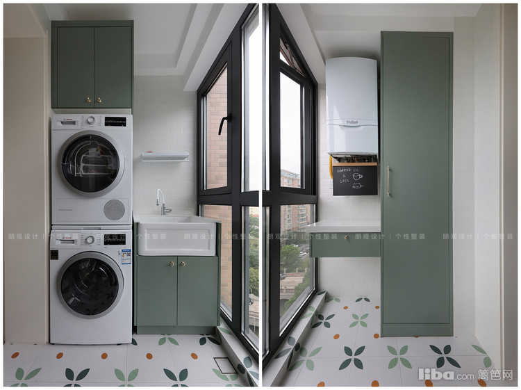 北阳台为洗衣区兼顾实用与美观,洗烘机叠放释放空间,地面复古小花砖与储物过和洗漱池遥相呼应,弥漫着清爽时尚的复古韵味。