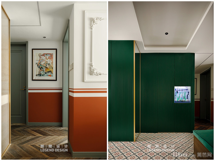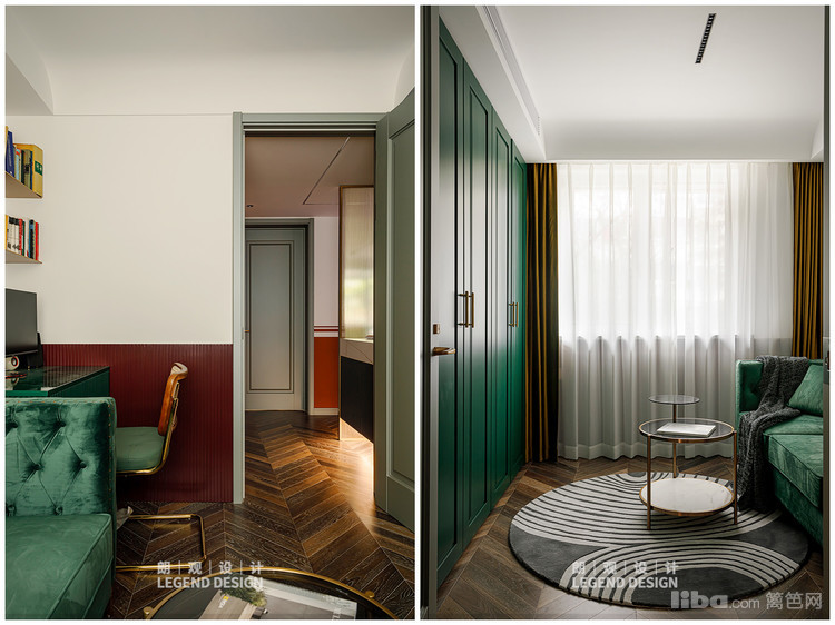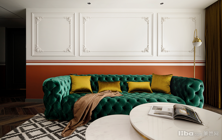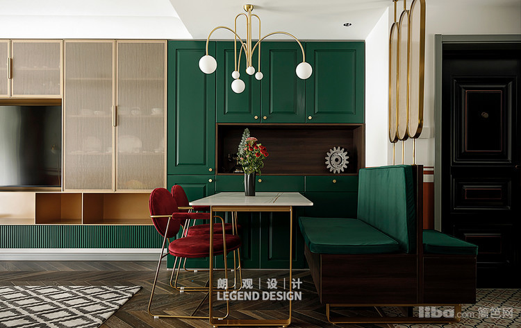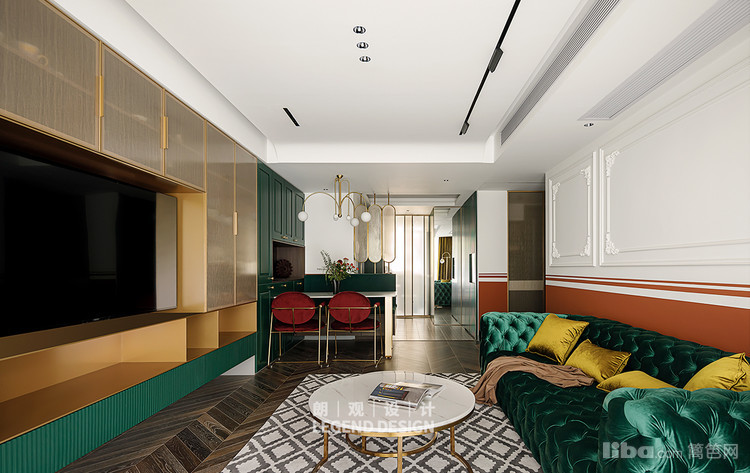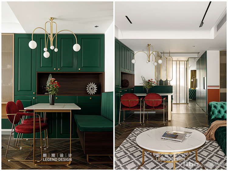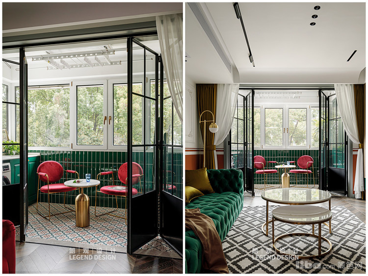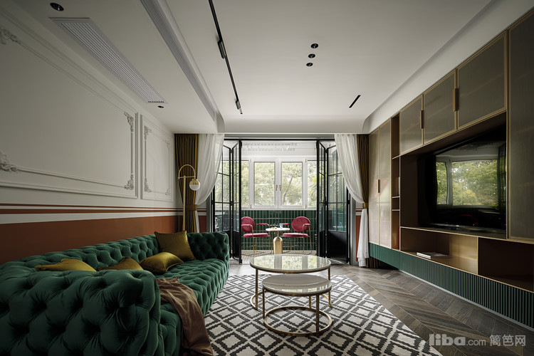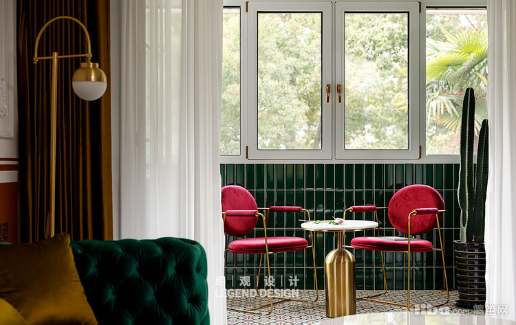 客厅采用颜色大胆,浓与烈的撞色,构筑出一个如老电影场景般典雅浪漫的起居空间。空间充满活力和个性,同时又能够保留摩登复古的韵味和独有的高贵。