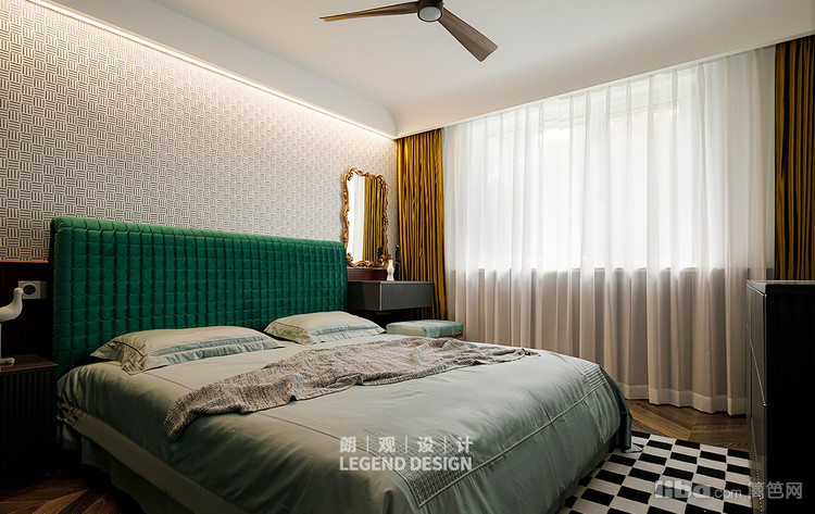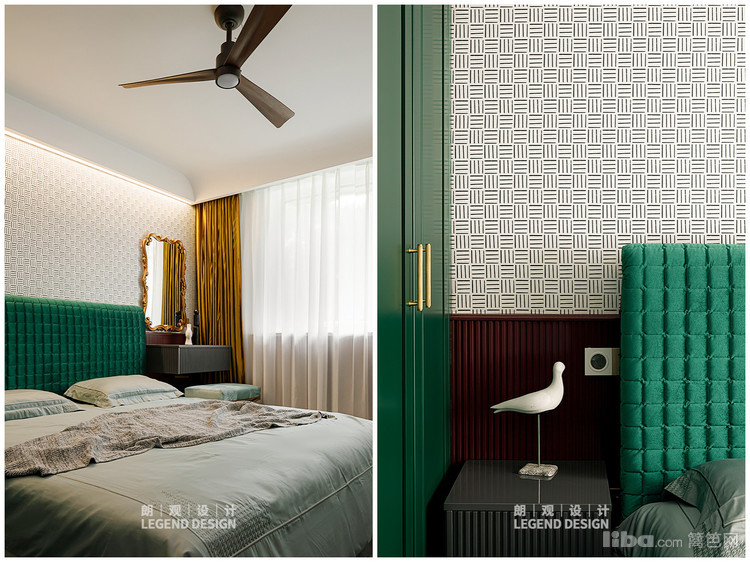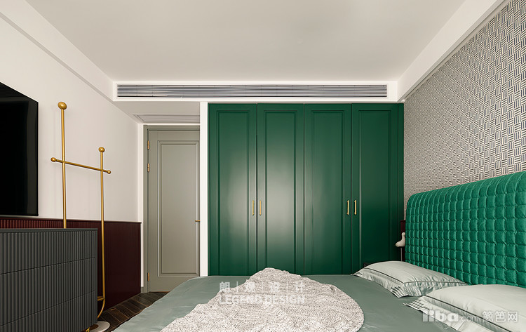 主卧继续延伸使用了类似客厅的撞色设计,复古风格有所呼应。