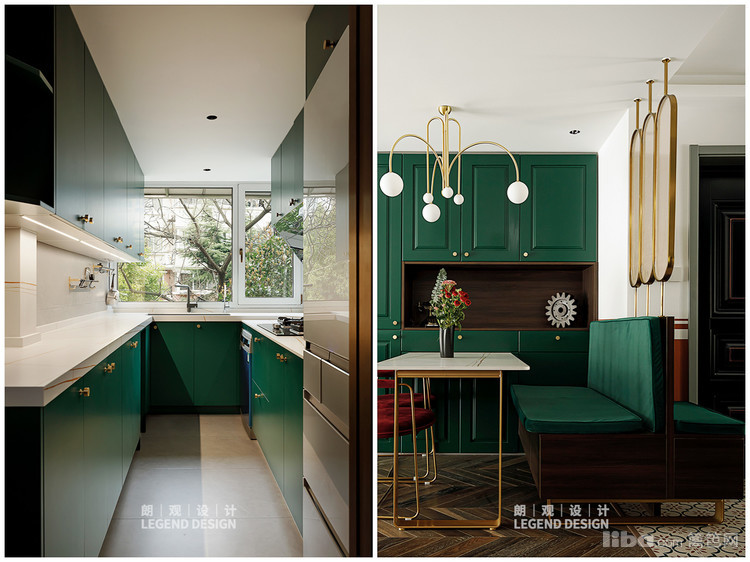 厨房小而精致,绿色橱柜搭配黄铜把手,复古而高级,增加了整个厨房的美感。
