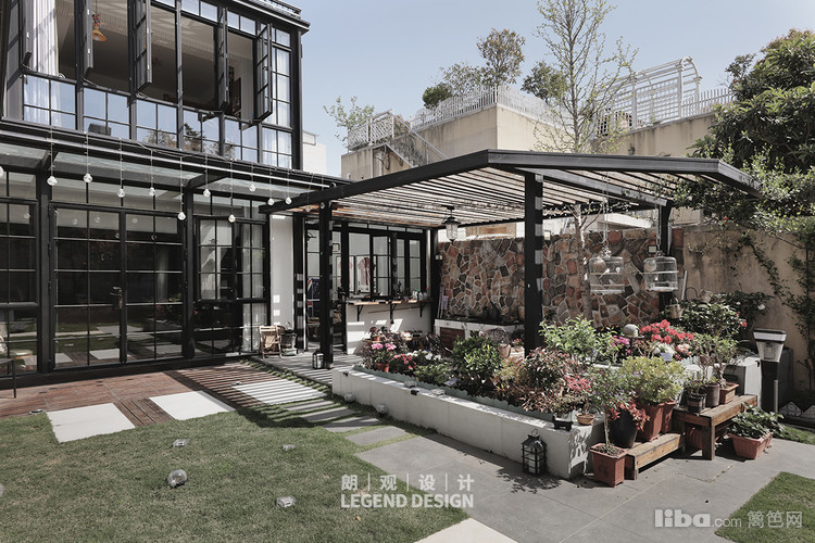 房子是一套独栋别墅,站在后花园的中央位置,可以看到全貌。整座房子呈L型,包围住外围一角的花园,正好围合成一个方正的布局,有分有合,关联在一起。