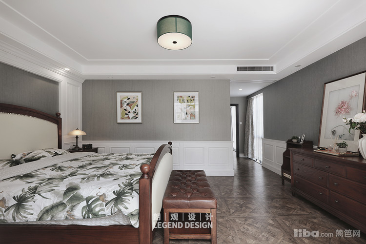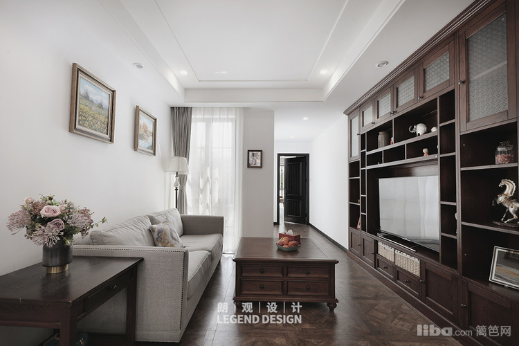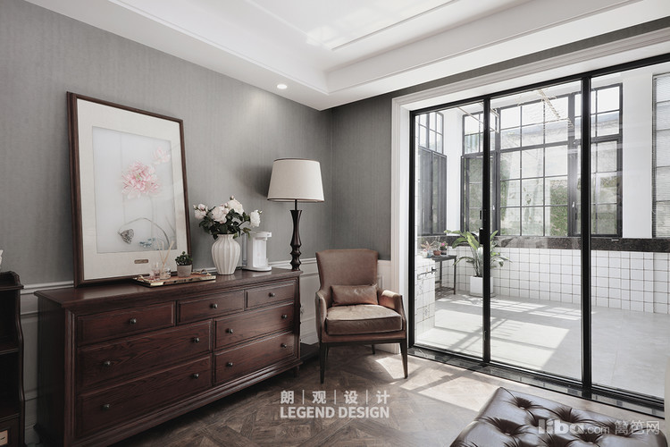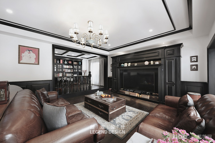 围合式的布局下,设计师用点、线、面的一个个细节,精致打造出客厅摩登、大气又怀旧的复古感。