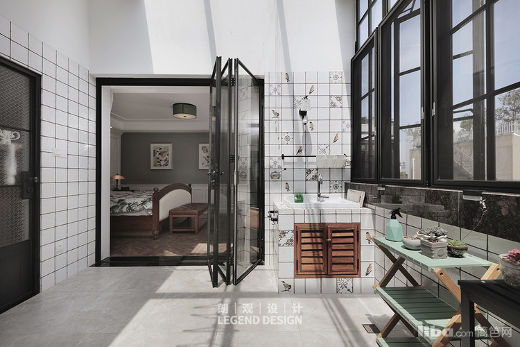 卫生间以黑色为主基调,洗手区复古的格纹花砖带来格调的既视感。