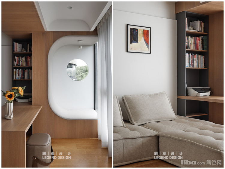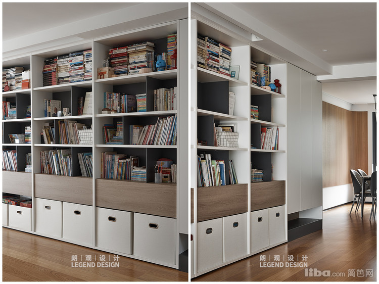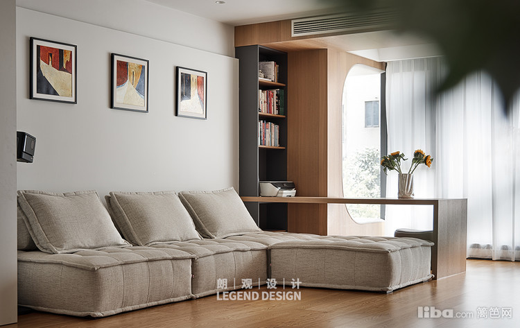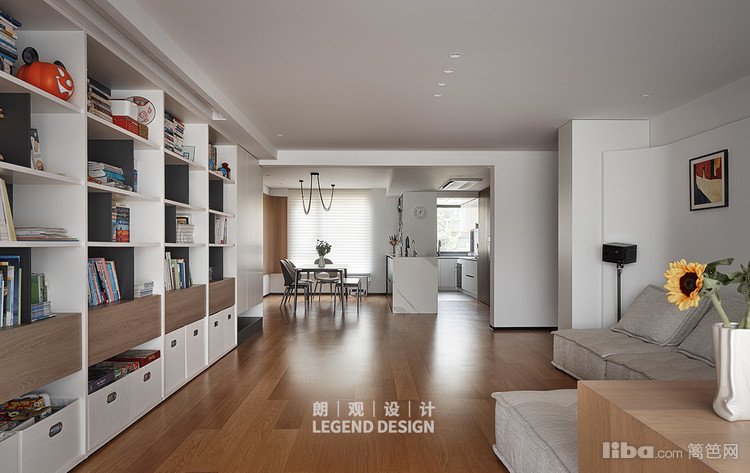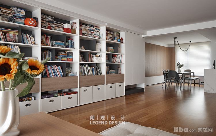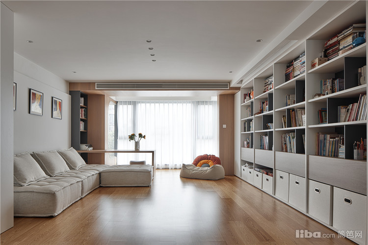 步入客厅,书香之家的时尚气息铺面而来,满墙的书籍、浅灰色的布艺沙发、原木色的地板和家具营造出温馨而自然的家风格。