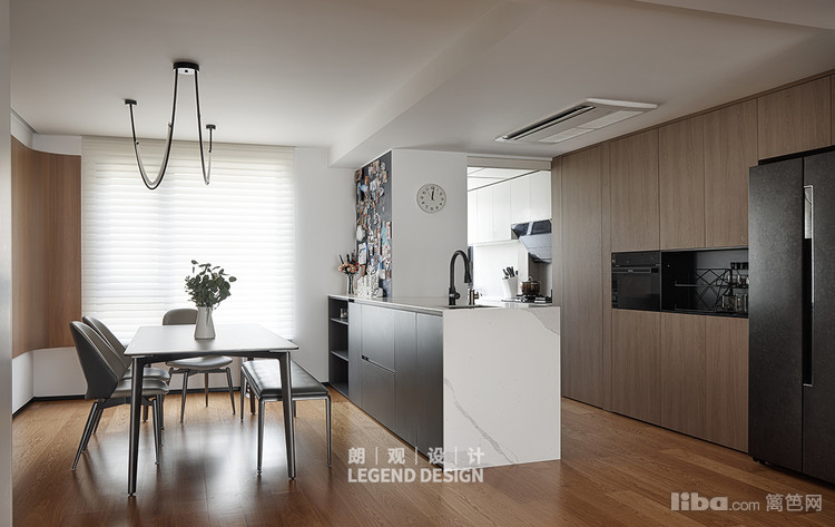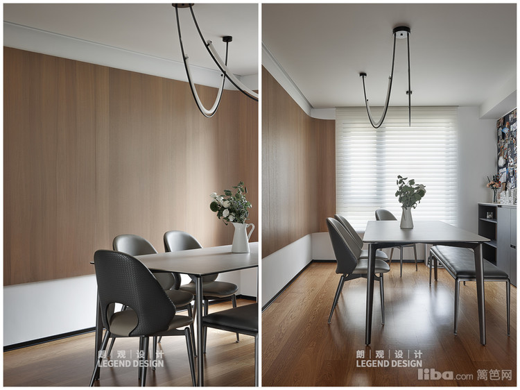 餐厅紧邻客厅,用木饰面做背景墙,简约大气,后期还可自由搭配装饰,装点出个性的氛围。餐桌和餐椅风格简约,加以吊灯的搭配,极富设计感。一家人在美观、舒适的环境中,可以尽情地享用美食。