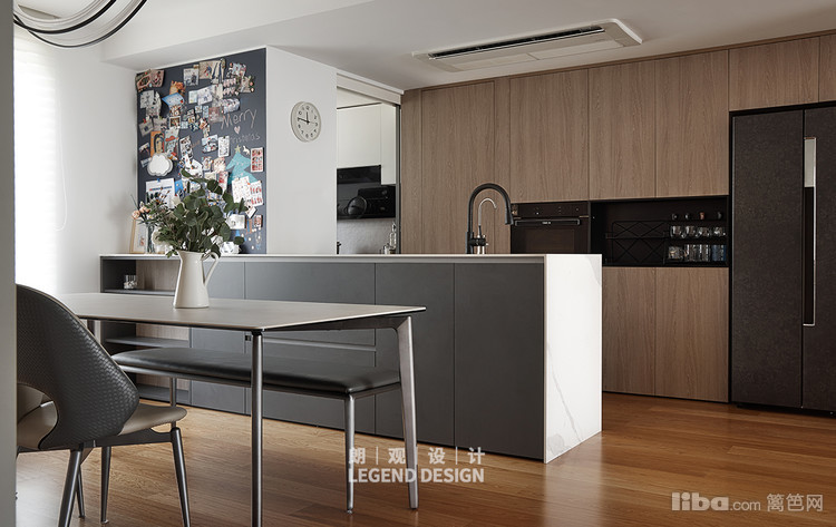 中西厨是开放式的,与餐厅相邻,方便同时进行中西餐的烹饪和准备。中厨空间不大,功能区U型排布,紧凑有序,可以容纳2人同时下厨,使用便利。
