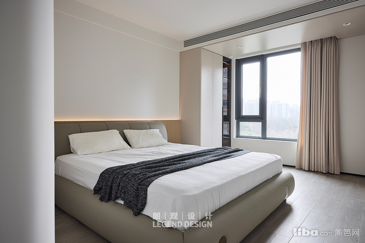 主卧里,简白的床头背景强做了分段的处理和灯光的设计,搭配床和床品,为业主营造简约、高级的视觉感受和舒适的睡眠体验,其他元素的色彩也相互交融,搭配恰好。