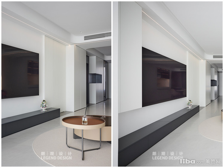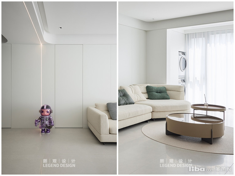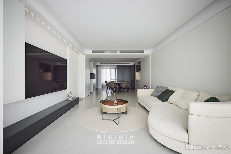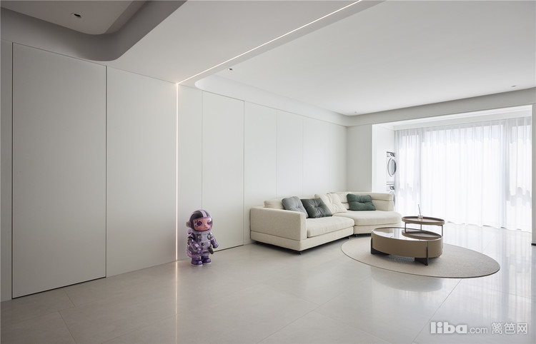 客厅简白风格,线条优雅、造型低矮的浅色沙发增加空间的宽敞感,搭配浅色圆形地毯和深色的子母造型咖啡桌,深浅对比,色彩和谐。