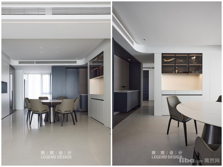 独立的用餐区,餐桌椅色彩深沉,成为整个区域的视觉中心。旁边带灯光氛围设计的餐边柜加以衬托,让空间多了几分轻奢的高级感。