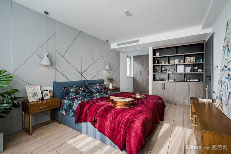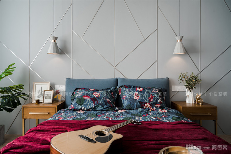 主卧床背景墙是整个空间最大的亮点,背景墙上镶嵌金属条,做出不规则的几何形状,低调又显个性化的设计。
