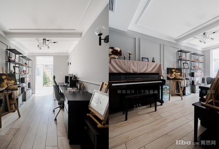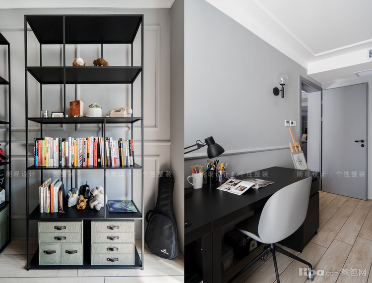 书房整体设计更显简约,铁艺的书架和灰色墙面,营造出loft的感觉,充满个性。