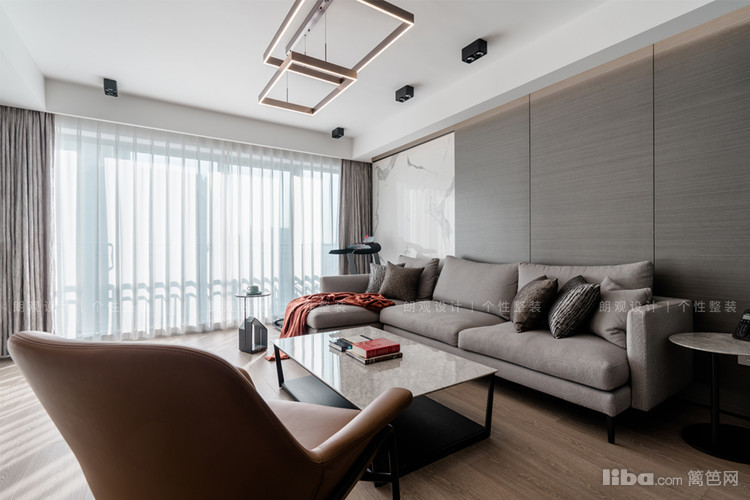 客厅以灰色作为主基调,沙发背景墙,大理石与木饰面的碰撞,彰显沉稳大气,简约与时尚,折射卓尔不凡的家居韵味。深咖色单人座椅为客厅增加了靓丽的色彩,提升了整体空间的明亮度。