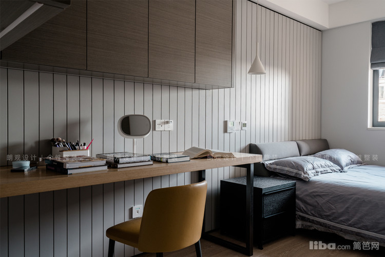 次卧兼顾书房功能,灰色系护墙板和现代感家具,诠释业主干练的性格。超长工作台可满足业主工作学习的需求,墙面定制的半封闭半开放柜体,即可增加次卧的储存空间,又能摆放经常拿放的书籍。