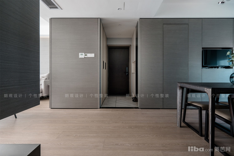 从门厅进入,左边区域为餐厅,餐厅和阳台相连,为了提高利用率,阳台设计成洗衣区,阳台和餐厅之间定制了小型吧台。餐厅主色调采用浅灰色,搭配实木餐桌,舒适温馨。