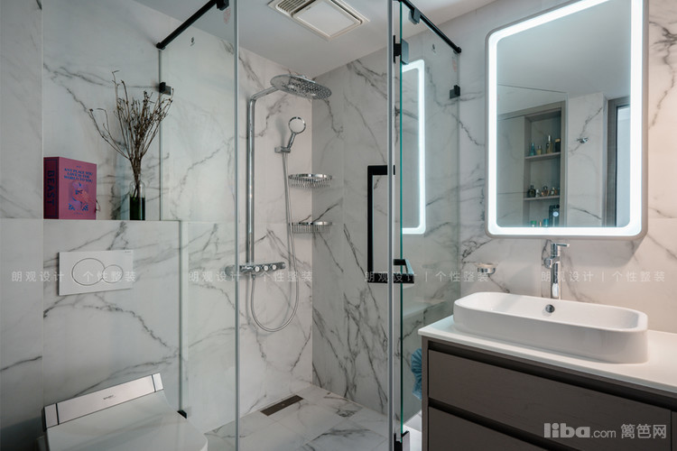 主卫设计在主卧套间内,原始设计面积较小,局促感明显,向卧室扩展后,功能齐全。象牙白大理石纹路瓷砖搭配品质洁具、金属质感吊灯,整体空间干净利索,时尚舒适。