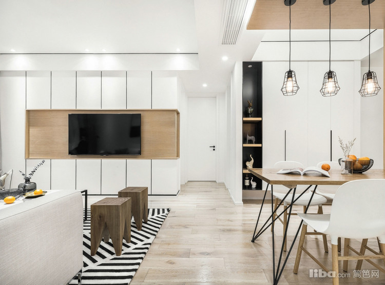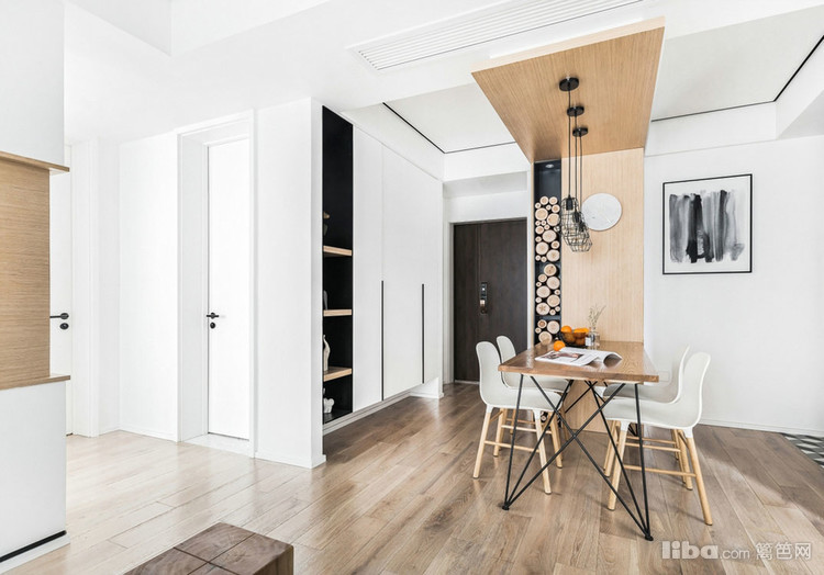 用简单的石膏板刷白代替传统的白色墙板,搭配木饰面和黑色不锈钢压条在保留了质感的同时也节省了费用。