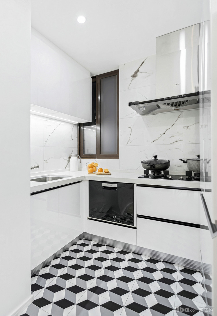 厨房我们同样以白色为主色调,黑色线条做点缀,配上地面的几何花纹,时尚且酷。