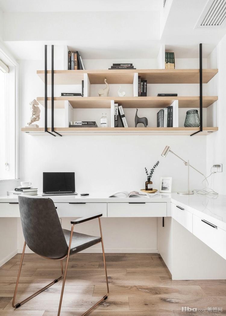 书架层板我们用木饰面层板加白色烤漆立板和黑色不锈钢压条的混搭,让整个空间不显单调。