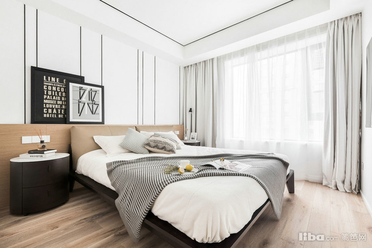 床头背景墙跟电视背景墙一致,白、黑、原木黄的搭配现代简约又透着一小股子北欧风,冷暖适中。不会太繁杂,也不会太单调无聊。