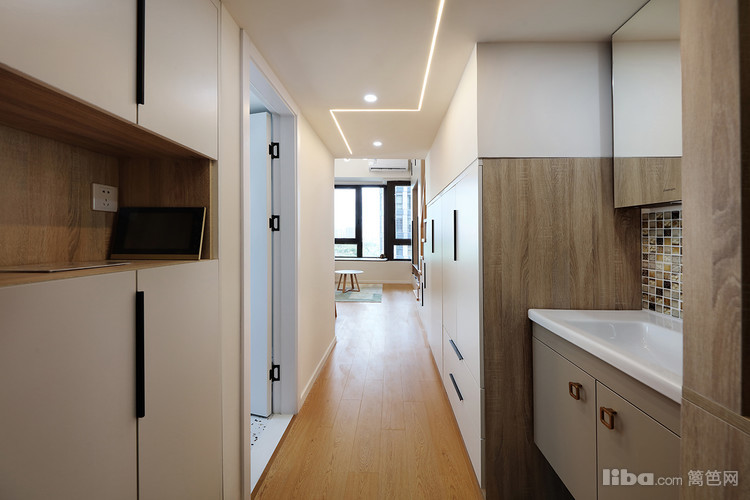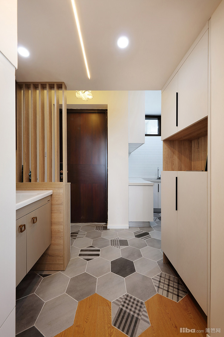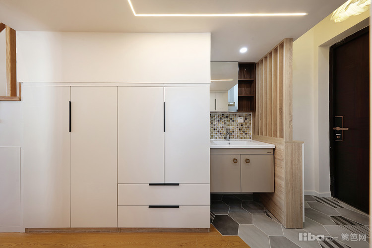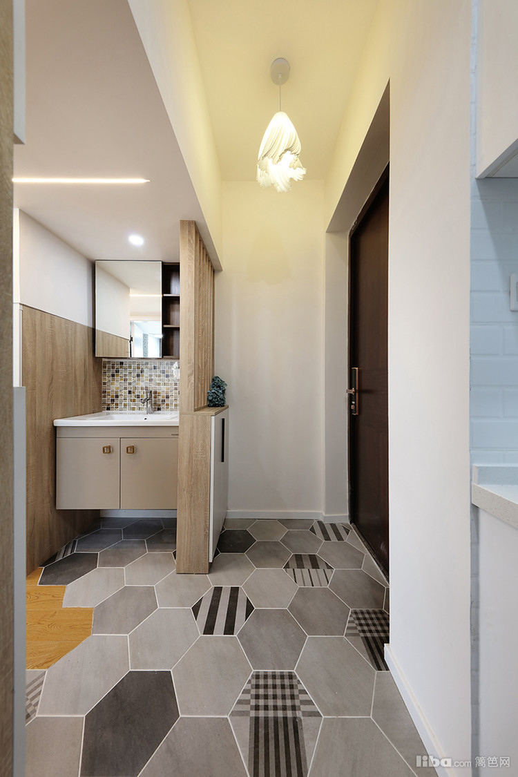 这时候可以采用隔断式玄关柜设计,让家重新划分出多功能空间而不杂乱,增加视野的宽广性和储物性,一组矮柜、一扇屏风。同时将底部悬空式设计的洗手台隐藏在玄关柜后,美观且实用。