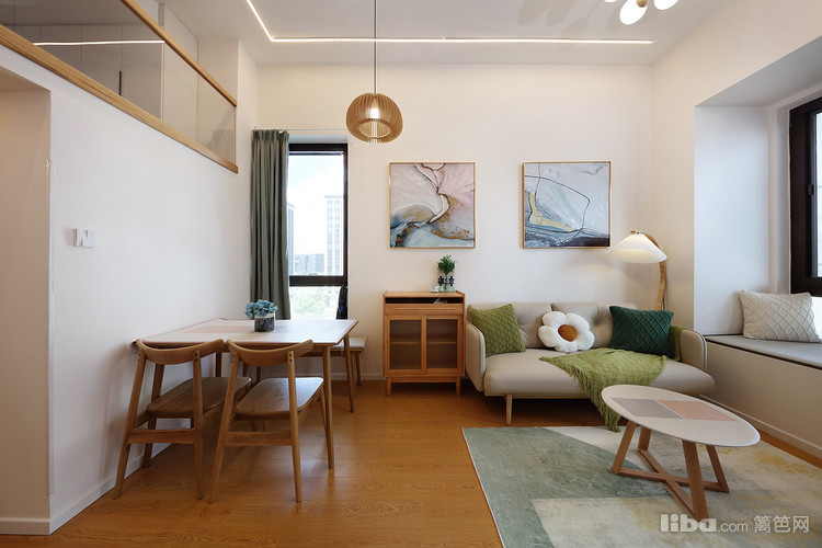 大白墙搭配浅色家具,餐桌靠墙摆放,营造出轻盈的空间感。米色餐边柜可以收纳碗筷餐具和电视遥控器等杂物。放置在餐厅和客厅之间,既保有两个空间的独立性,又增加了空间的层次感。