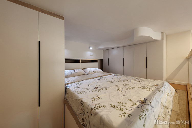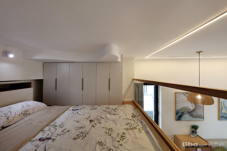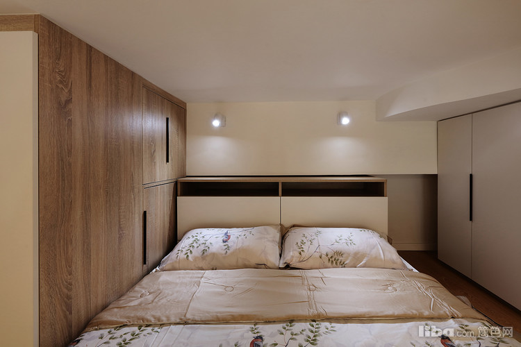 阁楼上的卧室自带宁静温馨的气氛,灯光只需要满足日常的休息即可低色温的两盏射灯,来帮助业主改善失眠,能够尽快的入睡。
