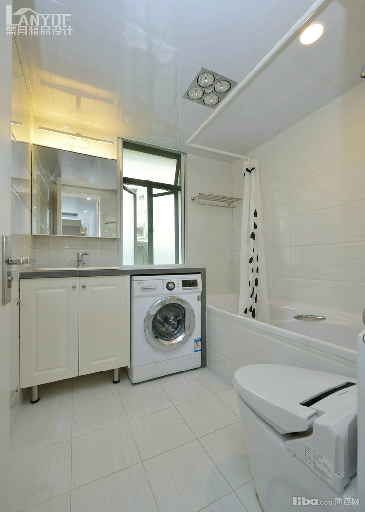 洗衣机选用滚筒式,和洗手盆台面一起打造,让平时生活的一些瓶瓶罐罐有处可放。