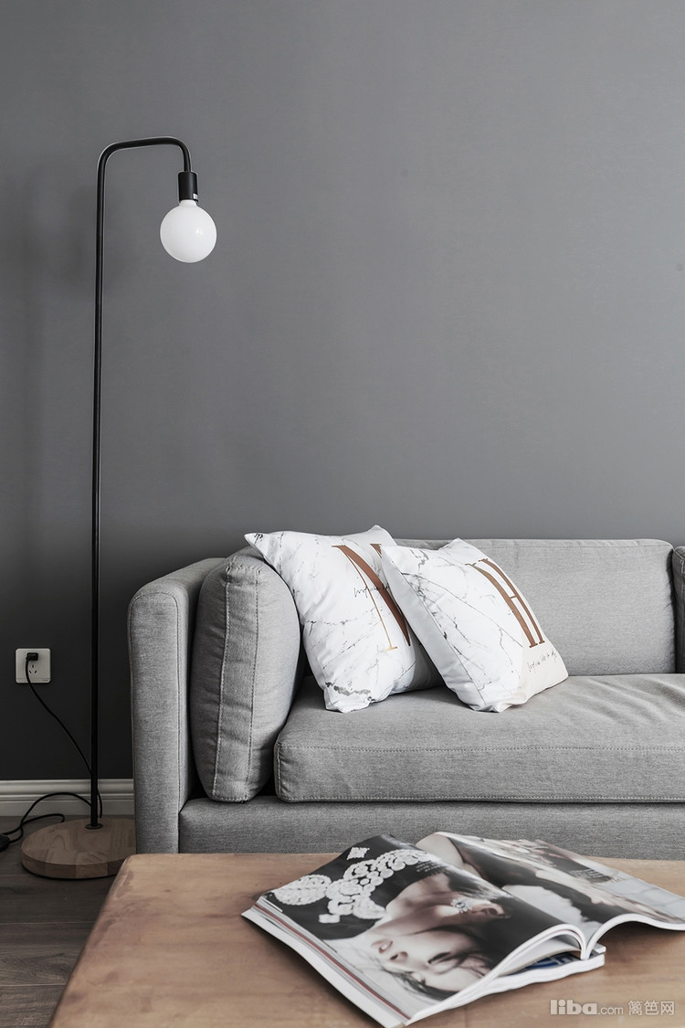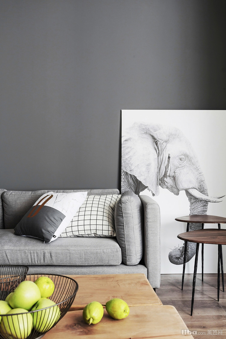 整体灰调,用不同的材质及色调的灰色来做层次区分,沙发背景墙选用深灰,结合主沙发的浅灰,加深视觉上后退的围合感,原木茶台,油油绿植温润了整个空间。
