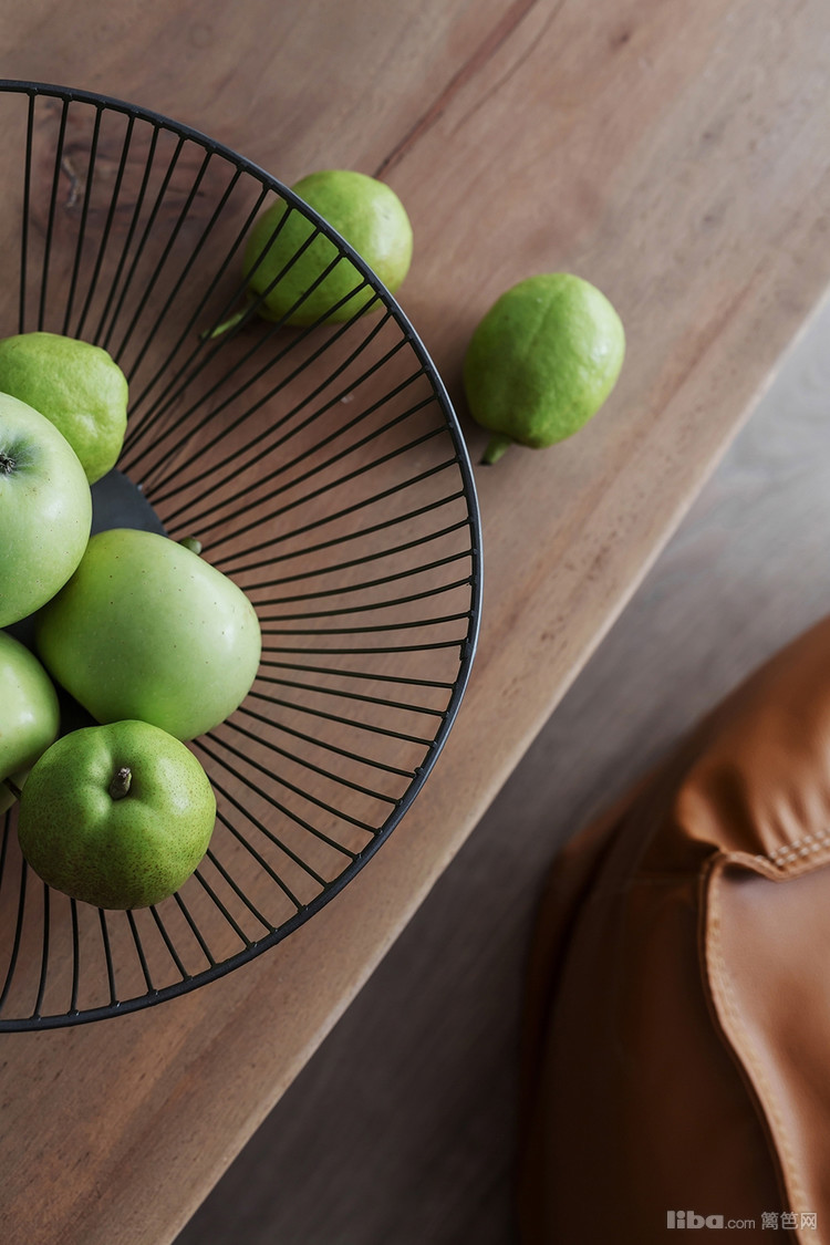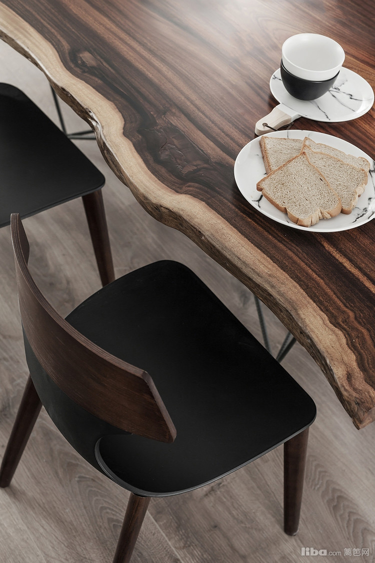 餐厅选择自由生长形态的大体量木质桌面,吸引着主要通道的目光,聚焦属于餐桌上的精致美味。