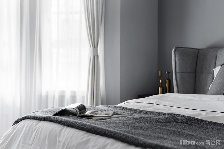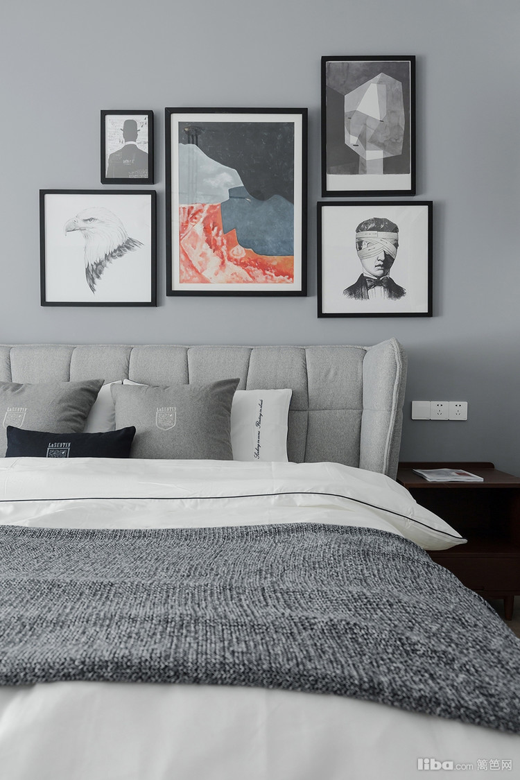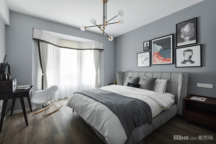 主卧好比一曲爵士乐;灰色层次是它的节拍,组合挂画、金属吊灯、梳妆桌椅随着节拍即兴摇摆,静静感受这种律动带来的仪式感。