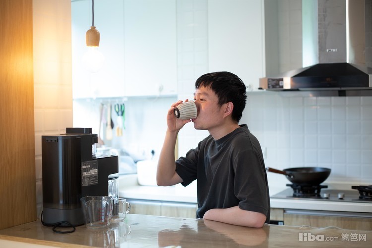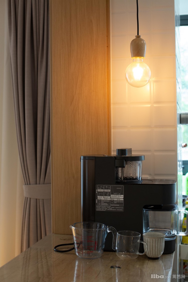 客厅沙发后面做了一个水吧用来作为厨房跟客厅的连接。把原来的墙体拆除了一半,做成现在的水吧,这个设计既可以满足业主平时爱喝咖啡和茶的习惯,又让空间设计感倍增。