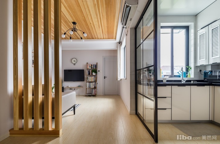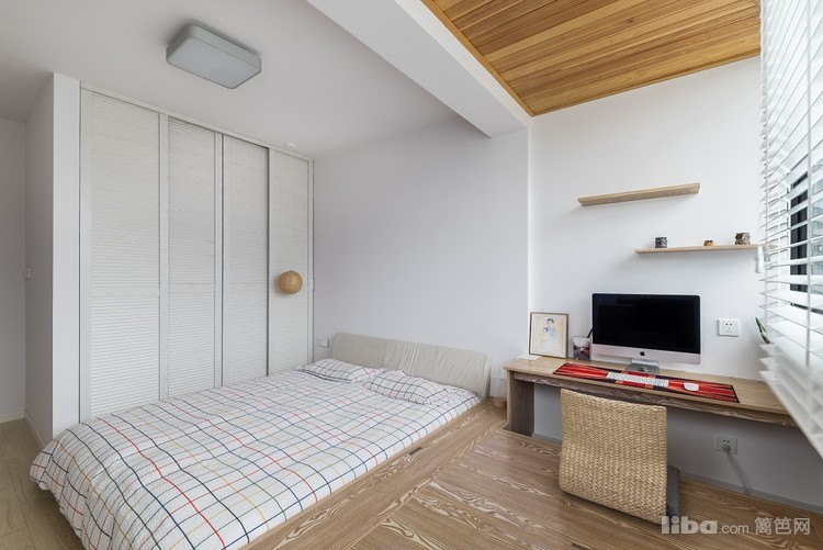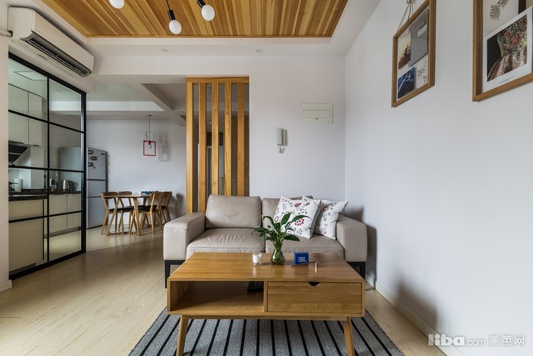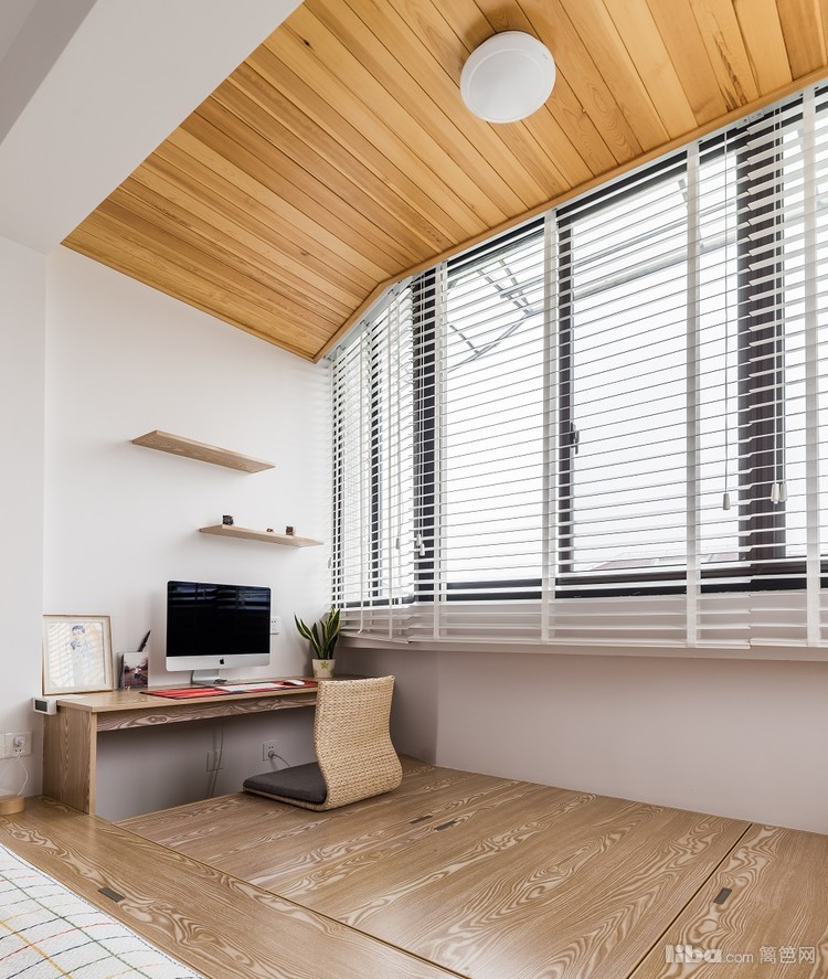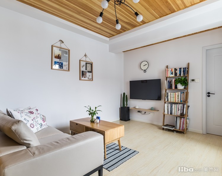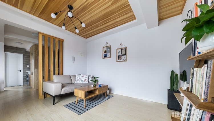 原木色的地板上顶,和客厅吊顶相呼应,整个风格相互呼应。