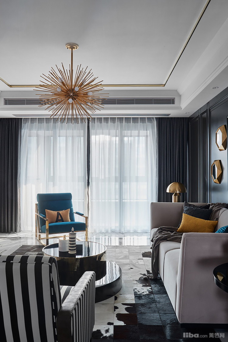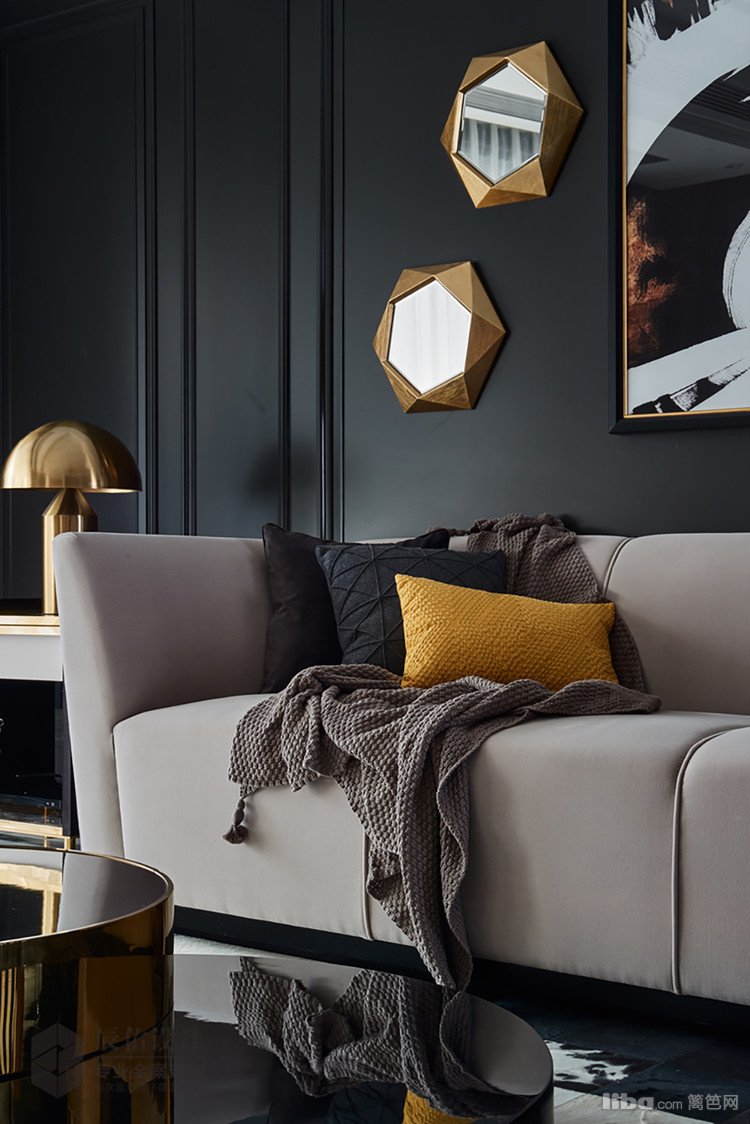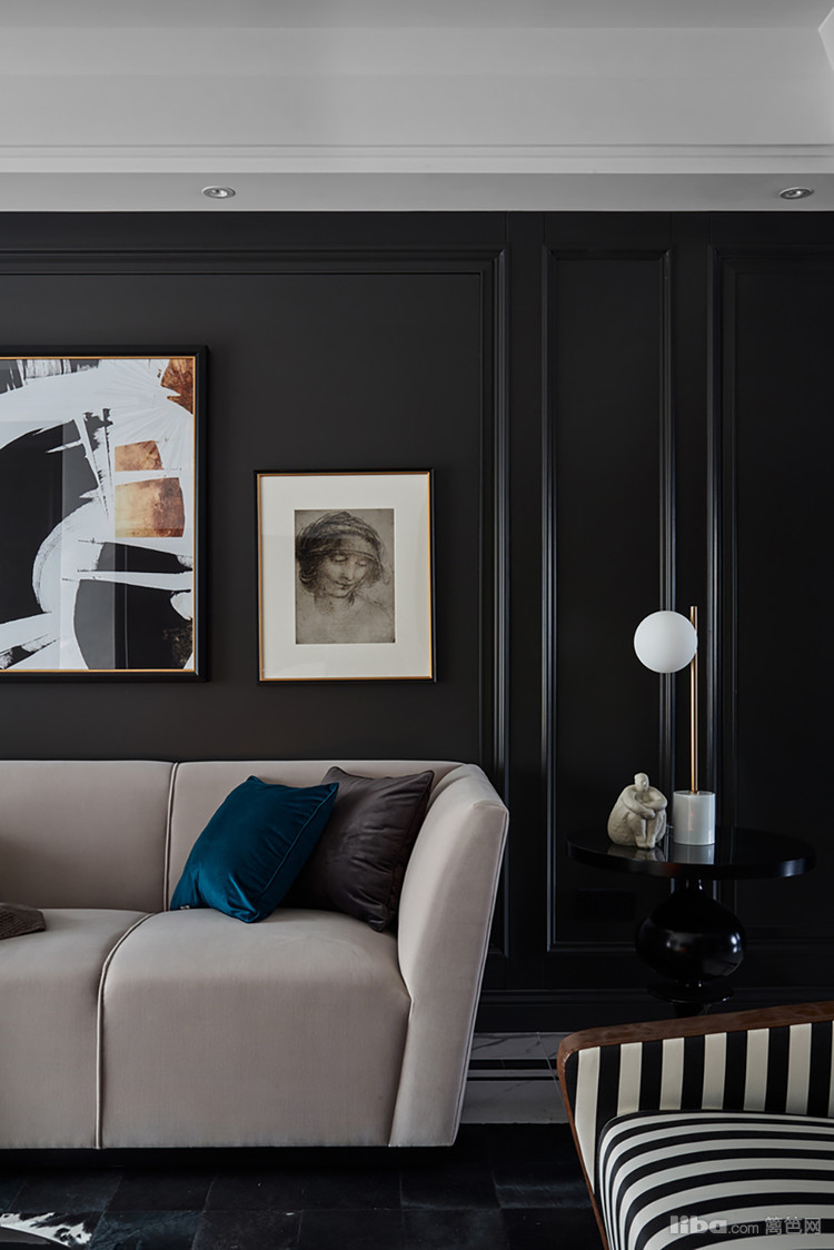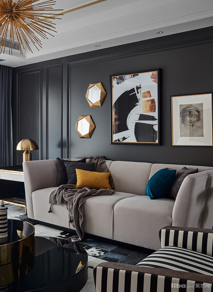 整个客厅的风格以美式为主,墙面以黑色背景为主,同时又显得时尚高雅