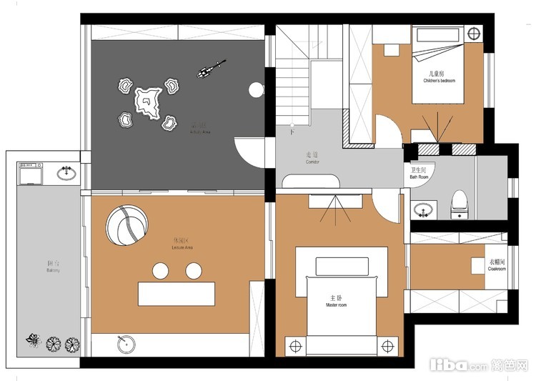 平面图为上下两层,一层为活动区域为主,二层主为卧室