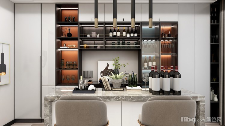 餐厅以现代风格为主,因主人有收藏名酒习惯,打造了一个轻奢时尚的餐厅酒柜