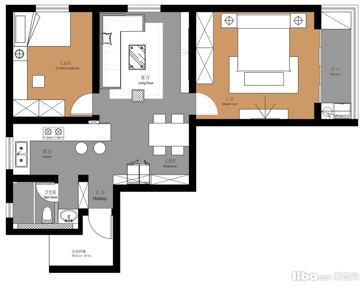 户型为两室两厅L型户型,客厅采光较弱空间较小