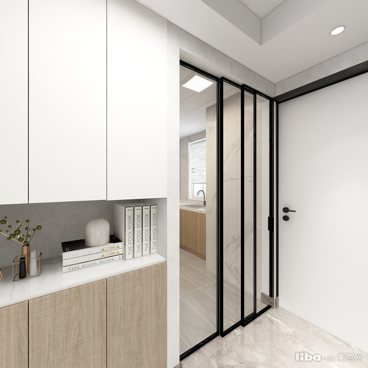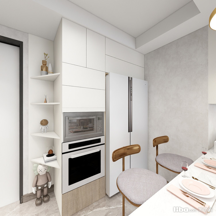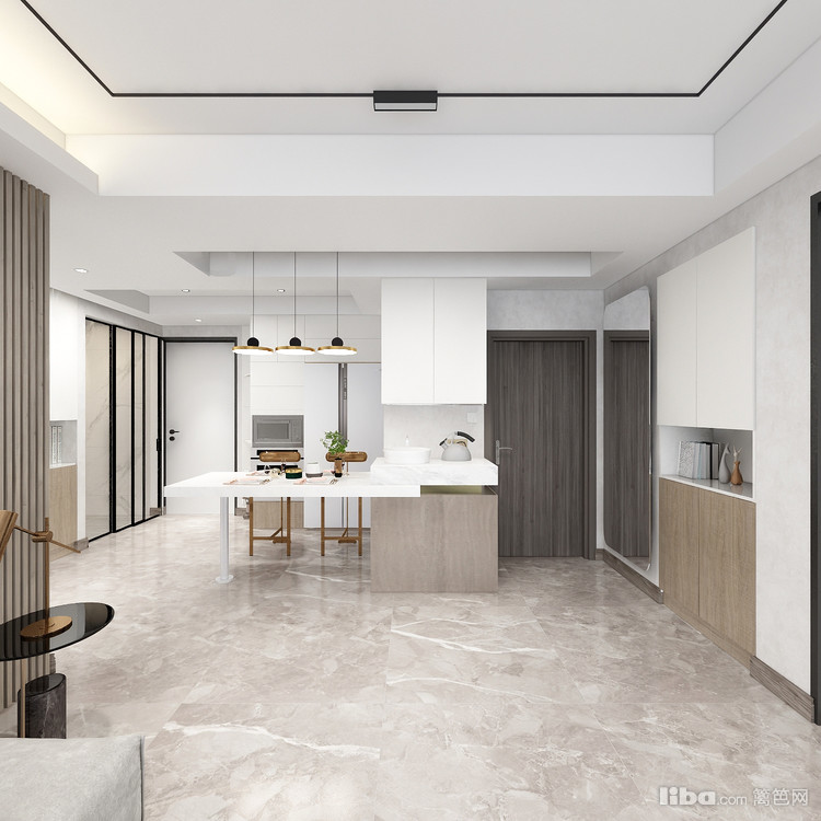过道完美的划分了客厅与餐厅之间的距离,让活动空间有所富余餐厅靠墙做定制柜,把一定的空间最大化,既不会破坏整个空间的整体美观性,又能扩大一定的储物空间。整体空间还是延续了简约的风格。