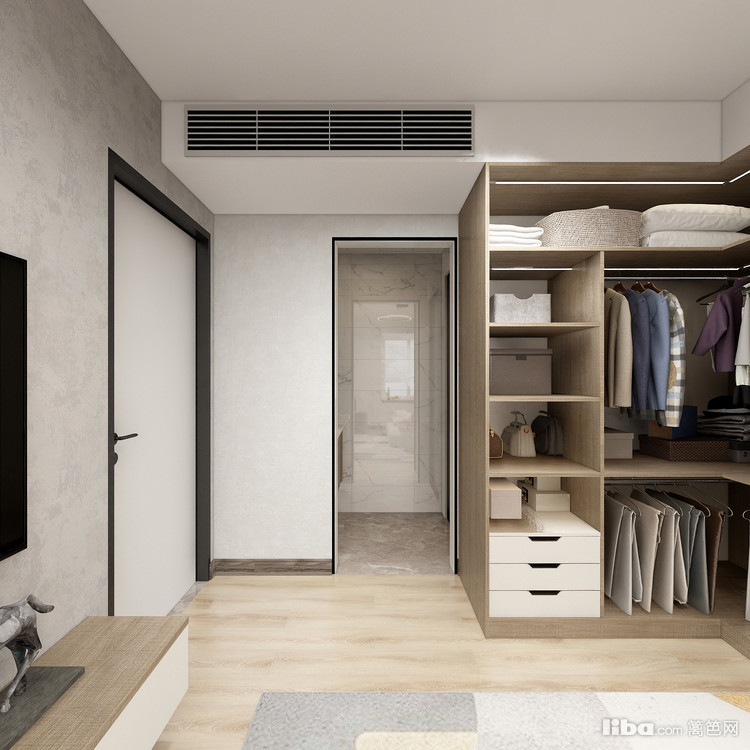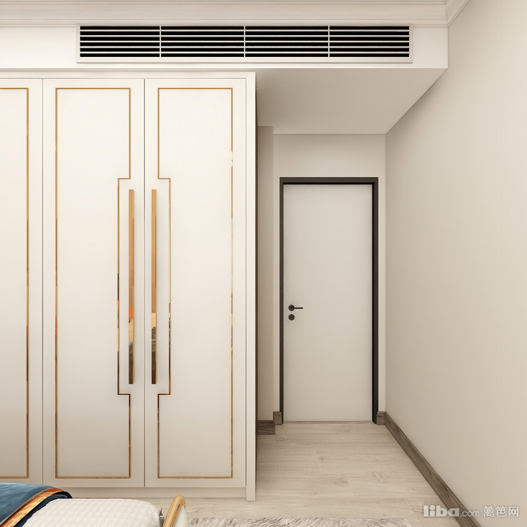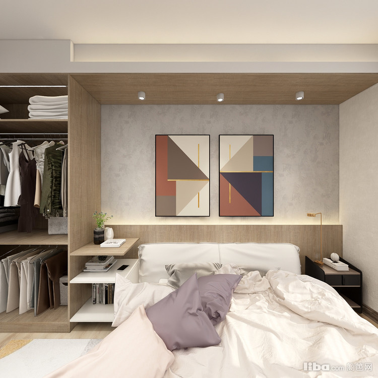 主卧背景选用不对称的饰面料结合硬包背景在搭配上圆环灯,线条感十足,瞬间让整个空间上升了一个档次。衣柜细节之处有金属线条嵌入,让背景墙面视觉上更有质感。