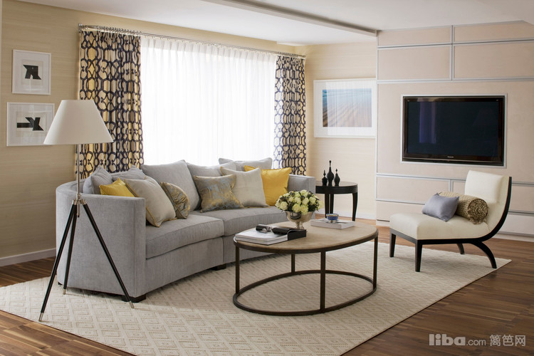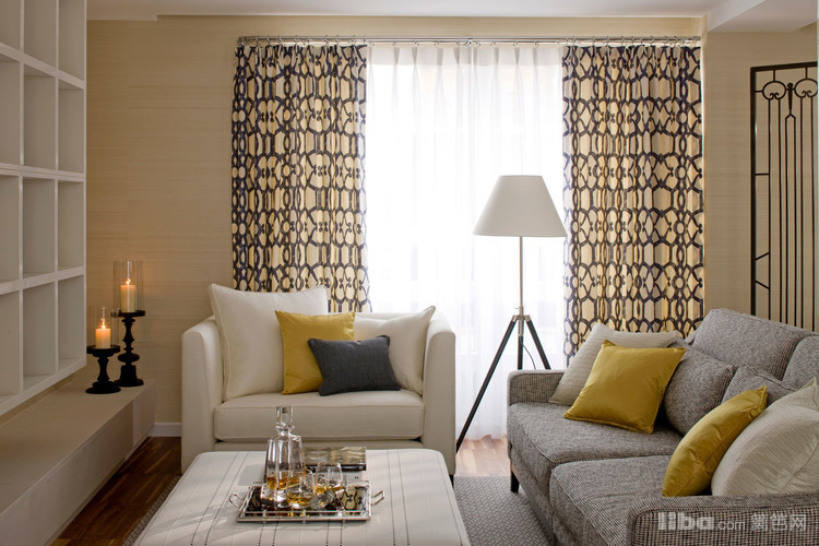 沙发旁边点缀一盏黑色三脚架,白色灯廓的,立式台灯,完美的点缀了客厅。