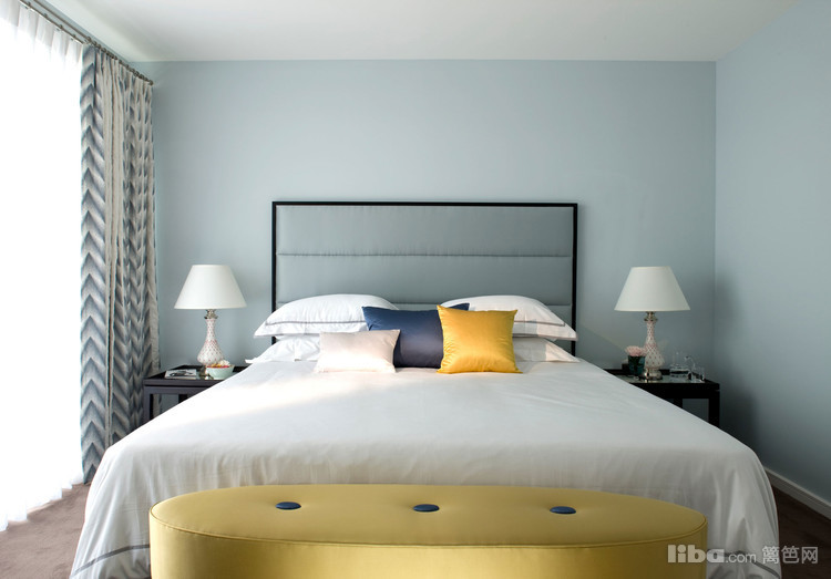 蓝灰色的背景墙,搭配黄色和白色,让空间介于暖色和冷色之间,温馨感十足。