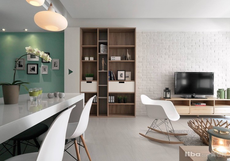 电视墙储物柜面积大,原木色,搭配上绿色的装饰墙和富有质感的白色电视墙,层次分明,简约美观又实用。