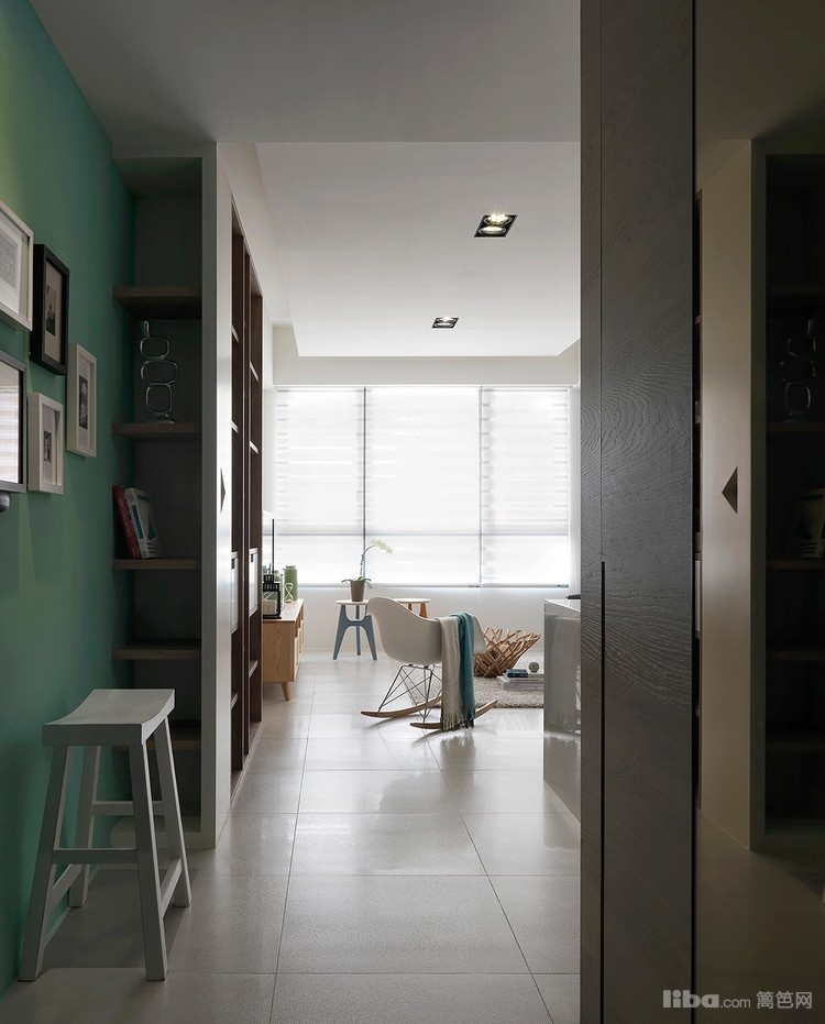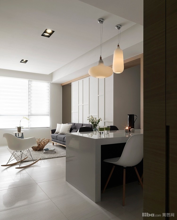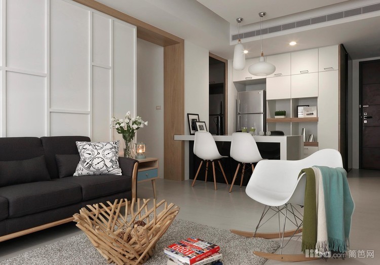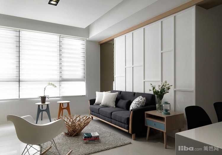 百叶窗、白色储物柜,层次感分明的沙发、坐凳、小摇椅构成了一幅美丽的生活画面,空间感十足。