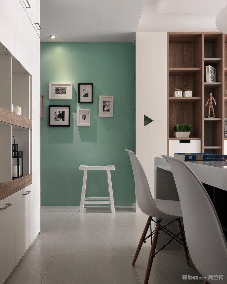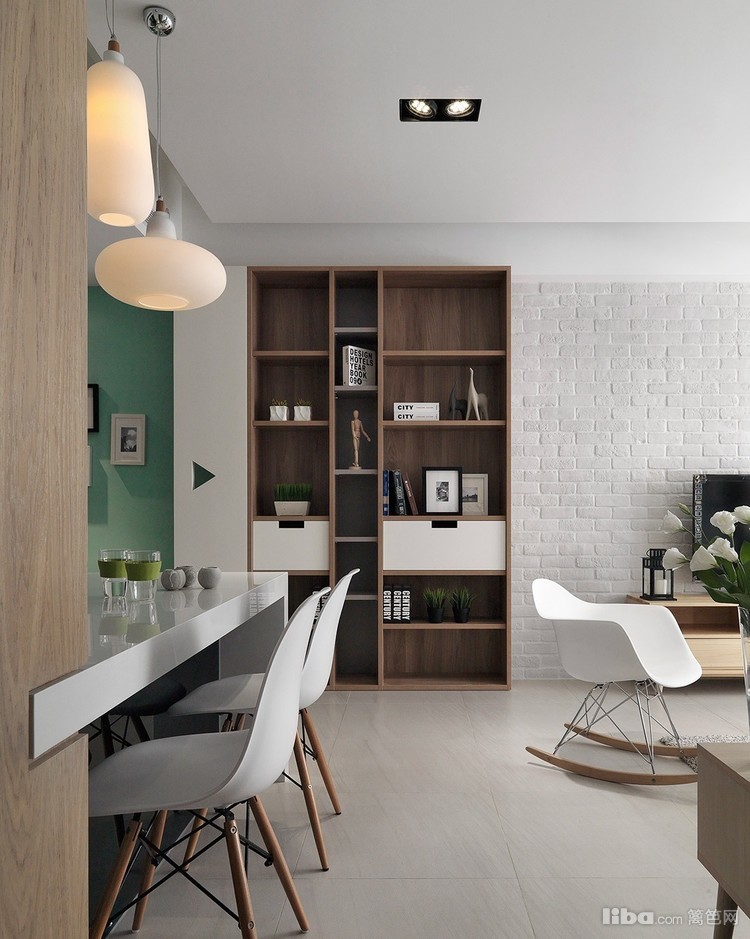 客餐厅一体的设计,墙上的白色装饰物也为餐厅稍稍分区。
