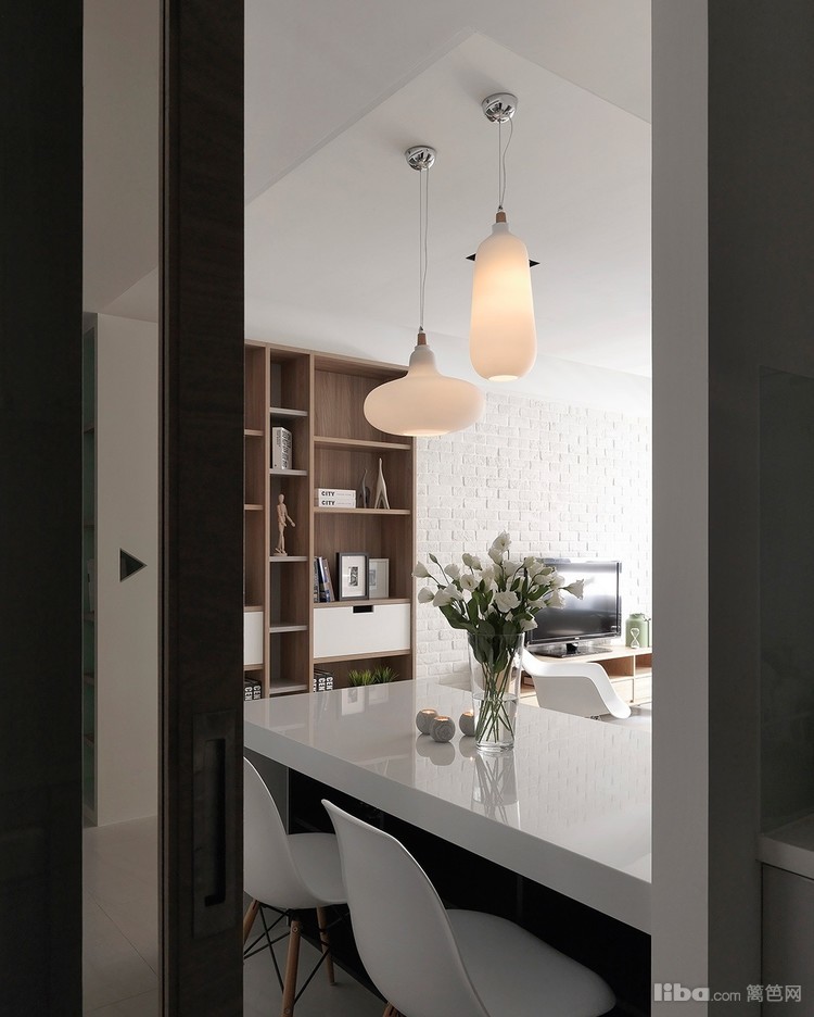 这里的灯饰是一大亮点,给白色基调的空间,降低了一点色调,使整个空间趋于柔和。