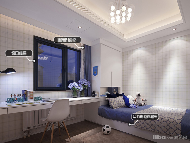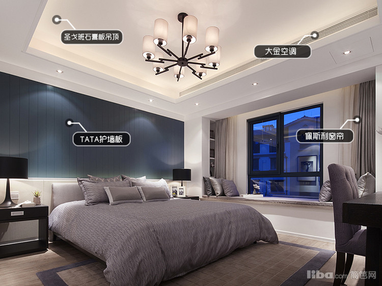 主卧的空间很大,用深蓝色的背景墙加深空间的深邃感,配合方形的吊顶,精致的吊灯,飘窗则用蓝色的玻璃,增加空间的高级感。