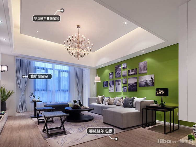 客厅的背景墙用青绿色装饰,搭配一组错落有致的生活画,吊灯十分华丽,又配合吊顶隐藏灯和轮廓灯的设计。