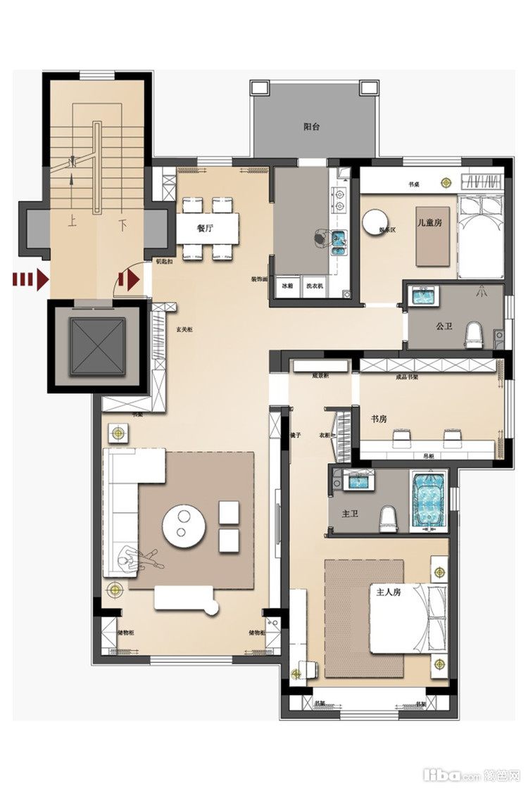 本案例户型属于比较正,因此户型上没有太大的改动,只是卫生间向北推了一点,然后利用主卧的空间做了书房。