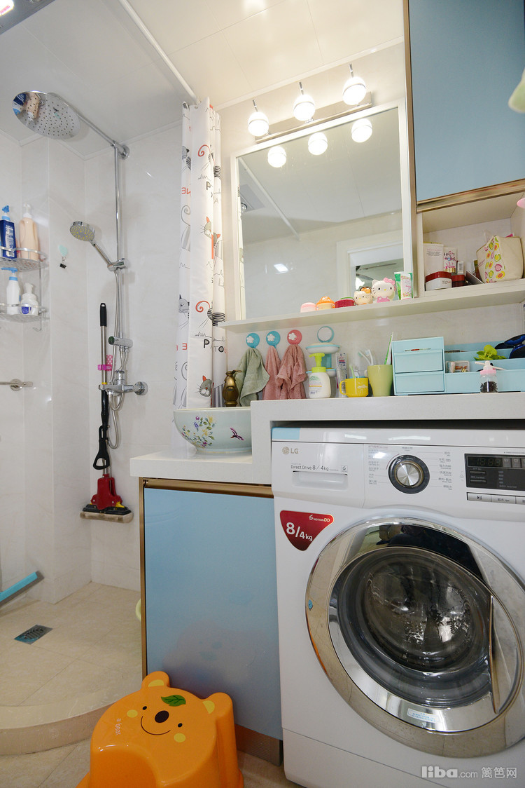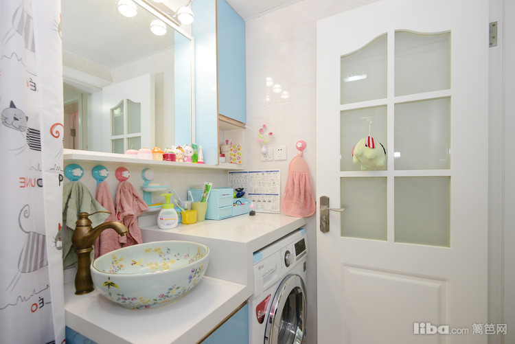淡雅的台盆搭配蓝色的柜体让卫生间看上去更加舒适~