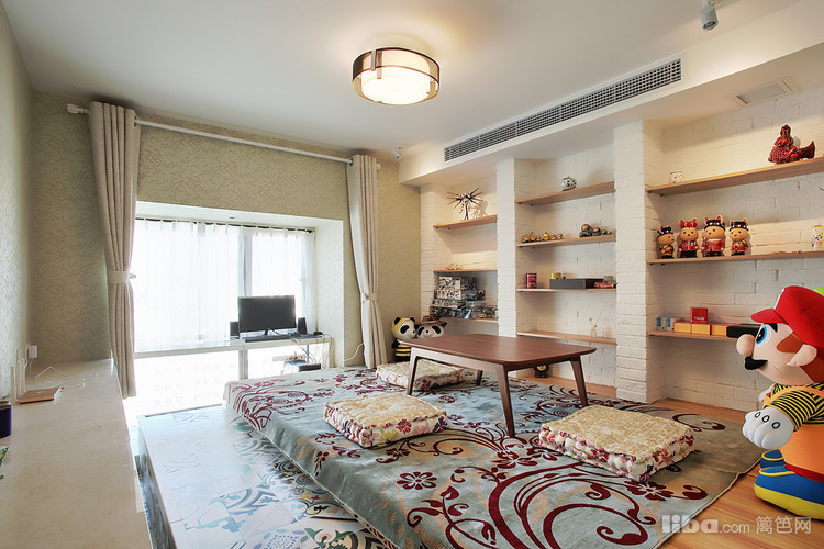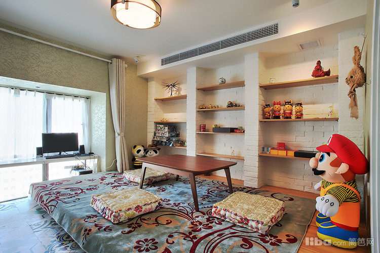 榻榻米房间背景则用白色文化砖,放置业主喜欢的玩偶,玩偶的缤纷色彩一下子从榻榻米的原木色系中跳跃出来