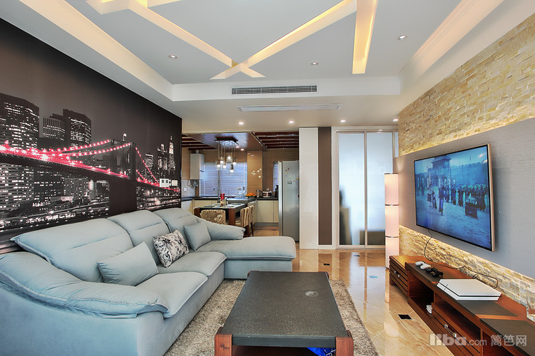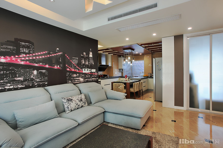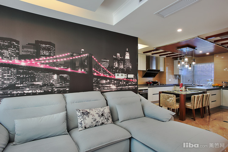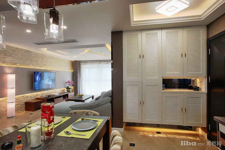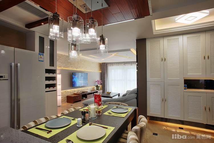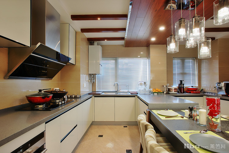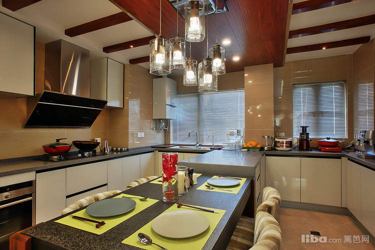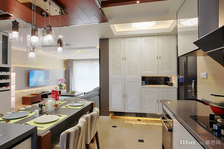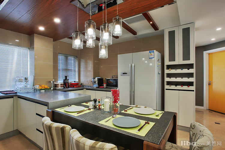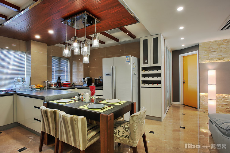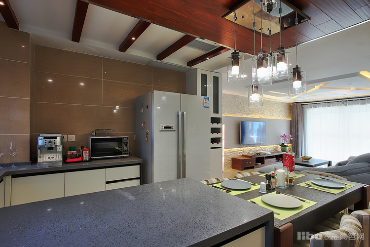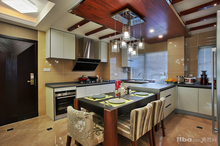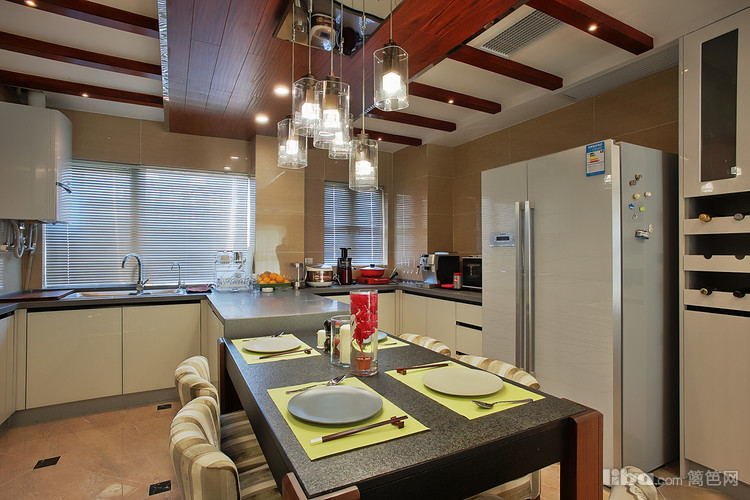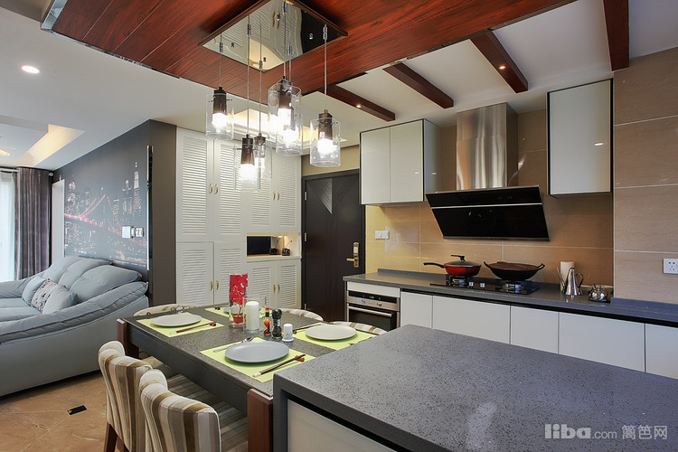 : 由于当初的原始房型餐厅的空间不是很大 所以设计师采用开放式厨房并与餐厅融为一体,这样厨房和餐厅各自的利用率都会大大的提升。然而厨房吊顶则采用地板贴顶